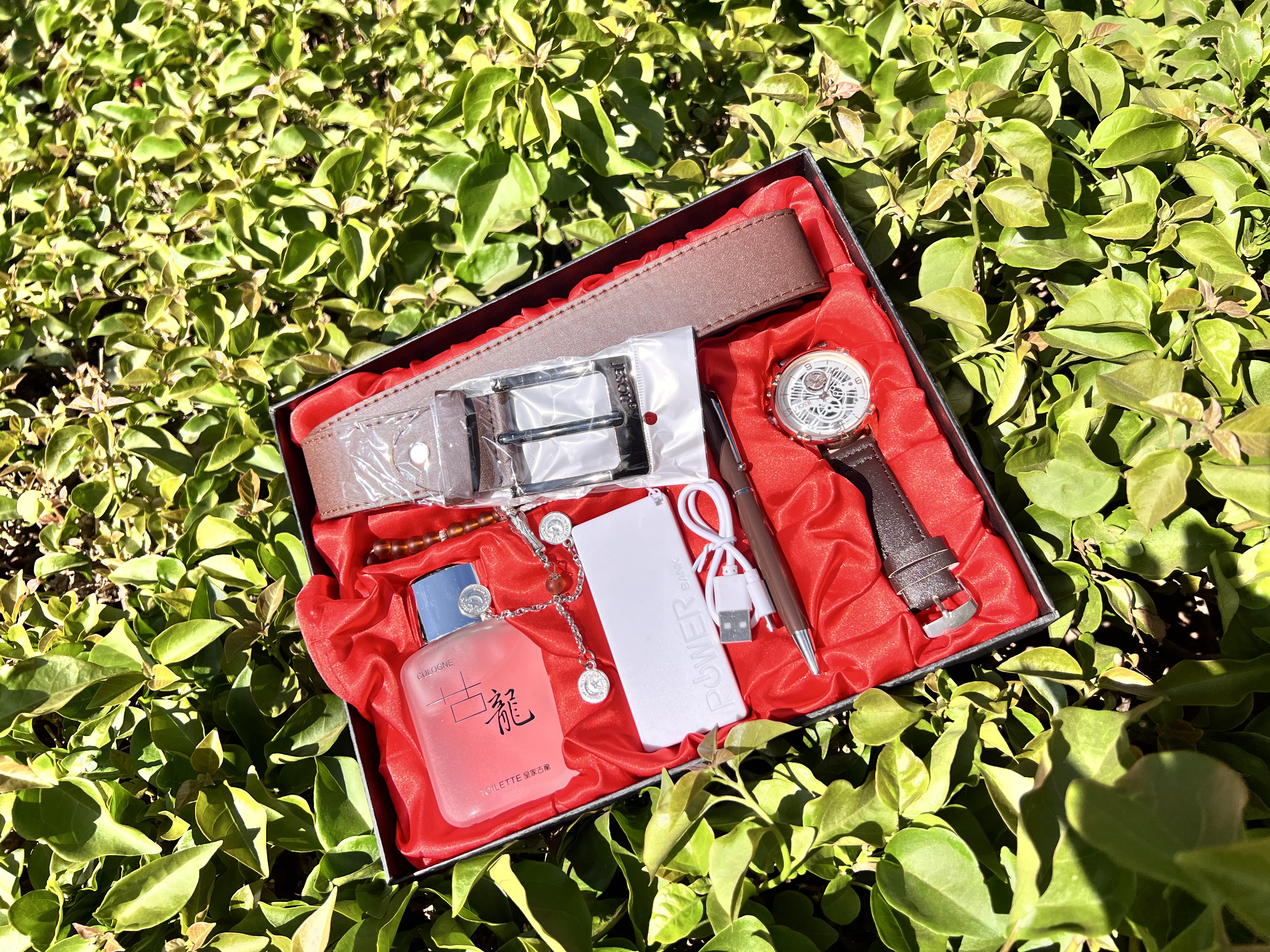 A Kings Hamper inclusive of spray, watch, pen, jewelery powerbank, belt and cable.